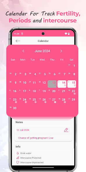 • Represents your fertile and ovulation days with a chance of pregnancy in the calendar.
