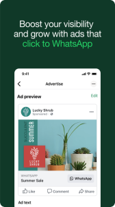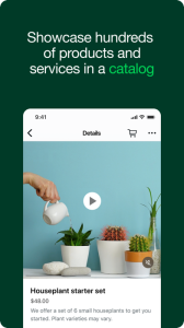 • Sell more and grow. Get discovered, advertise, and make more valuable customer connections. Boost sales by sending targeted offers to customers; create ads that click to WhatsApp; showcase your product catalog; and give customers the convenience of in-app orders and payments.**