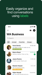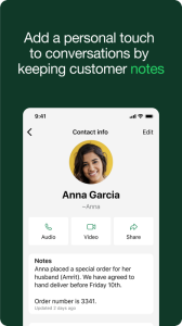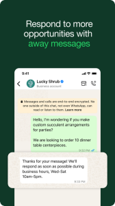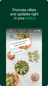 • Work smarter. Save time by letting the app do the work for you! Send customers automated quick replies and away messages so you never miss an opportunity. Use labels to quickly organize, filter, and find important conversations. Create a status to share an offer or news, and even take orders and payments** in-app to create a great customer experience.